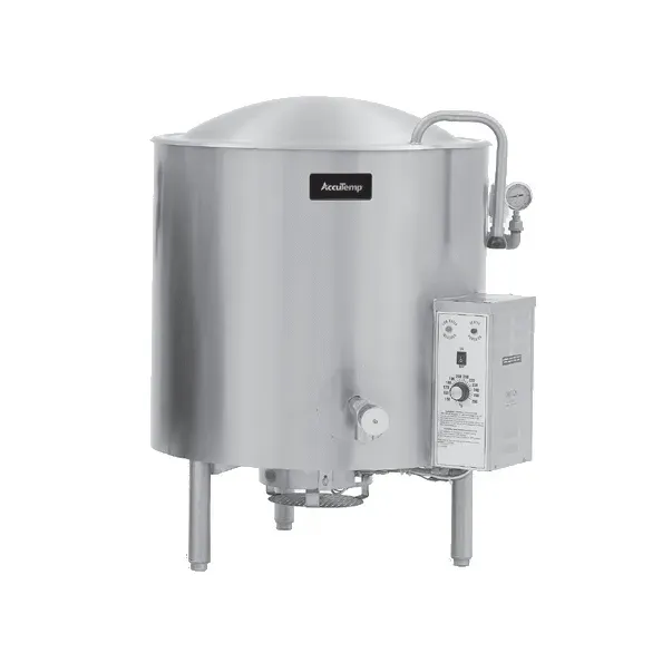 Upgrade your cooking experience with the AccuTemp ALLGB-125 Gas Stationary Kettle. Designed for commercial restaurant use, this kettle is a game-changer in the kitchen. With a generous 125-gallon capacity and a 2/3 jacket, it provides ample space and even heat distribution for large-scale cooking. The 304 stainless steel liner ensures durability and easy cleaning, while the electronic ignition guarantees quick and hassle-free start-ups. The self-contained, insulated design and deep-drawn stainless steel construction retain heat efficiently, saving you time and energy. The 2 compression draw-off valves allow for easy dispensing of your culinary creations. Mounted on legs for stability, this kettle operates at 30 PSI and delivers an impressive 154,800 BTU. UL and NSF certified, it meets the highest safety and sanitation standards. Elevate your restaurant's efficiency and productivity with the AccuTemp ALLGB-125 Gas Stationary Kettle.