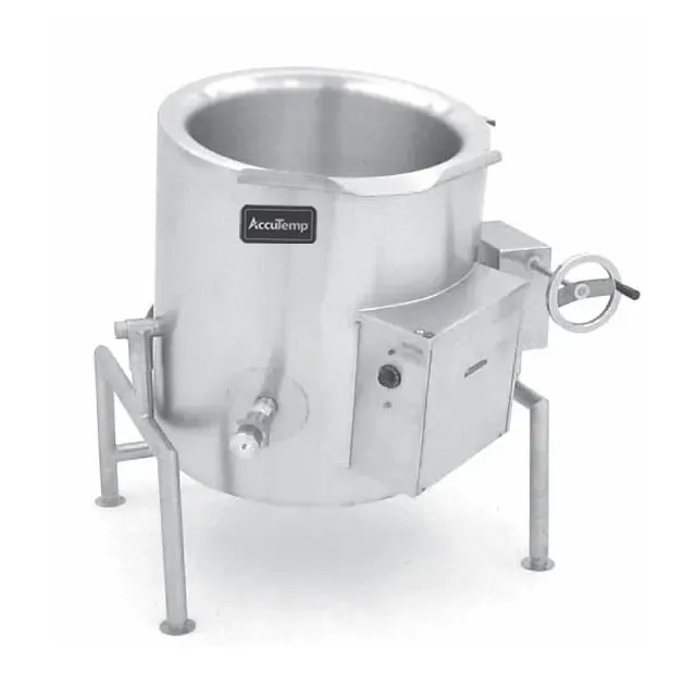 Elevate Your Culinary Journey with the AccuTemp ALTWE-20 Electric Tilting Kettle. Designed for commercial restaurant use, this kettle is a game-changer in the kitchen. With a generous 20-gallon capacity and a 2/3 jacket, it provides ample space and even heat distribution for cooking large quantities of soups, stews, and sauces. The 304 stainless steel liner ensures durability and easy cleaning, while the field replaceable heating elements guarantee uninterrupted operation. The self-contained, u-frame mounted design allows for easy installation and mobility, making it perfect for busy kitchens. The deep-drawn stainless steel construction and insulation ensure maximum heat retention and energy efficiency. Operating at 30 PSI, this kettle delivers fast and consistent results. With UL and NSF certifications, you can trust in its safety and quality. Upgrade your restaurant's cooking capabilities with the AccuTemp ALTWE-20 Electric Tilting Kettle.