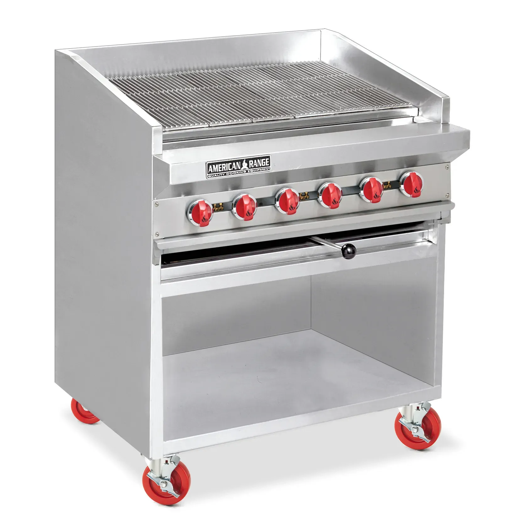 Master the art of grilling with the American Range ADJF-36 Charbroiler. This floor model gas charbroiler is designed to meet the demands of a commercial restaurant setting. With its adjustable top and radiant type burners, you have complete control over the cooking process. The 36" wide cooking surface features six burners and cast iron grates, allowing you to cook multiple items simultaneously. The three-position adjustable rack provides flexibility for different cooking needs. Each burner is individually controlled with pilots, ensuring consistent heat distribution. Made with stainless steel construction, this charbroiler is durable and easy to clean. The 6" legs provide stability and make it easy to move around. With a power output of 35.0kW and 120000 BTU, this charbroiler delivers high-performance grilling. Trust American Range, a reputable vendor known for their quality products. Elevate your restaurant's grilling game with the ADJF-36 Charbroiler.