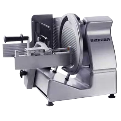 Equipped with a robust 13.8-inch (350mm) hard chromium-plated blade, the Bizerba 350M VS12F-PROSCIUTTO effortlessly handles prosciutto and other delicate meats. The aluminum meat feeding carriage, with its 4.235 holding points, provides exceptional stability and control, while the product support along the slicing path guarantees uniform slices.
