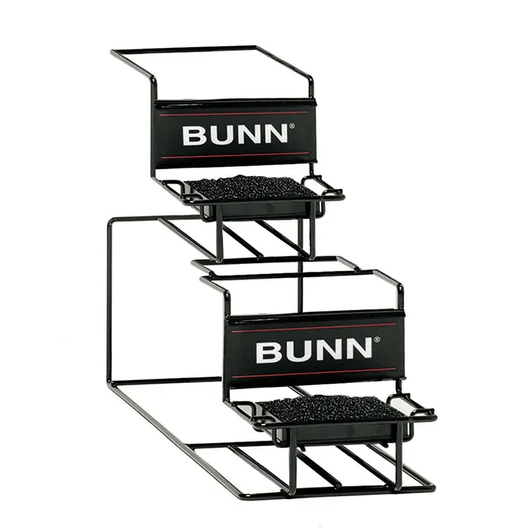 Equip for success with essential tools like the Bunn 35728.0000 Airpot Serving Rack. Designed for commercial restaurant use, this universal airpot rack is a must-have for any establishment that serves hot beverages. The carbon-steel wire construction ensures durability and longevity, while the sponge-lined tray keeps airpots secure and prevents damage. With both lower and upper racks, this versatile rack can display two push-button or lever-action airpots (not included), allowing for easy access and efficient service. Whether you're running a bustling coffee shop or a busy breakfast joint, this airpot serving rack will streamline your operations and enhance your customers' experience. Trust Bunn, a reputable vendor known for their high-quality products, to provide you with the tools you need to succeed in the restaurant industry.