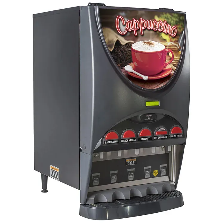 Transform your commercial restaurant with the Bunn 37000.0022 Beverage Dispenser. Designed for high-quality performance, this electric (hot) dispenser is a must-have for any foodservice establishment. With its 5 8 lb. hoppers, you can easily offer a variety of hot beverages to satisfy your customers' cravings. The dispenser has a capacity of 4.5 gallons per hour, ensuring a steady supply of delicious drinks. The lit front graphics and alphanumeric display make it easy to navigate and operate, while the cup clearance at 7.25" allows for convenient filling. The 7-gallon hot water tank and high-speed, heavy-duty whipper ensure efficient and consistent beverage production. Plus, the low product detection system and top-hinged, lift & key lock door provide added convenience and security. Upgrade your restaurant's beverage service with the Bunn 37000.0022 Beverage Dispenser.