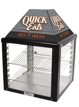 Front and back doors ensure your merchandiser stays stocked and keeps selling by giving both your behind-the-counter staff and self-serve customers easy reach-in access. Warm, circulating air holds food above 150°F. Wire shelves are height- and angle-adjustable. Header graphics add merchandising appeal.