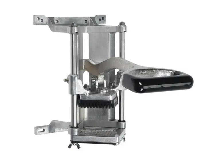 Save time and space with this convenient model that stays up off the counter. Features an ergonomic handle with the built-in leverage to easily cut through raw potatoes, onions and other tough produce. Made of aluminum.