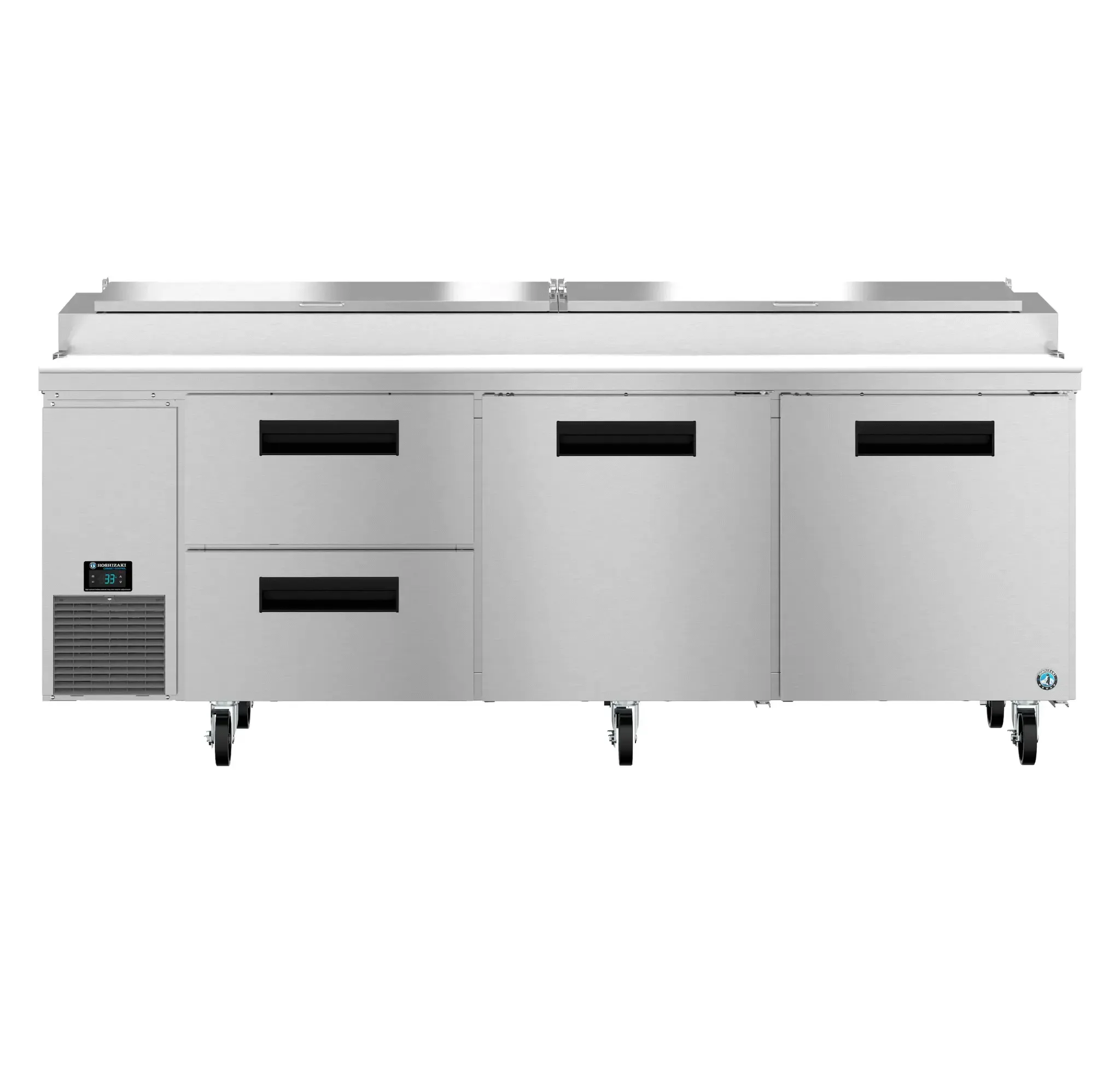 The PR93B-D2 is a Steelheart Series Pizza prep table, three section refrigerator with drawer/door combo. Engineered to maintain food safe temperatures in 100°F ambient conditions and with a net capacity of 29.3 cubic feet, this front breathing prep table refrigerator is the right choice for hot kitchens. It features a dual controller system for ideal temperatures in both the rail and cabinet.