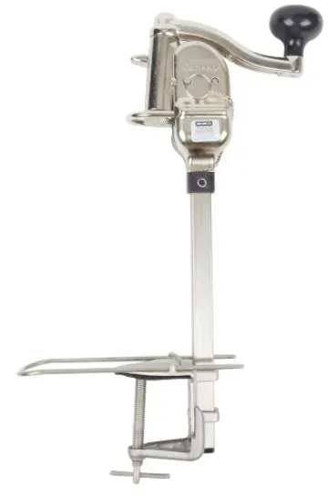 NEMCO’s unique mechanical design thinks outside the can! Instead of cutting down vertically into the lid, the CanPRO Compact cuts horizontally into the rim for improved food safety, as well as operator safety. Cutting from the outside, the blade assembly crimps as it cuts, eliminating the sharp edge that can slice a hand or damage a spatula. Plus, it leaves no metal slivers that can fall into the food contents.  Running the circumference of a #10-sized can just takes a few quick and easy turns of the crank. It’s adjustable to all can sizes and features a permanent mount with an optional temporary clamp, allowing you to move the opener around the kitchen.