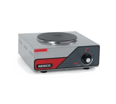 Introducing the Nemco 6310-1-240 Hotplate, a countertop electric appliance designed to bring commercial restaurant brilliance to your kitchen. Crafted with brushed stainless steel construction and a cast iron alloy burner, this hotplate is built to withstand the demands of a busy restaurant environment. With a six-position temperature control and built-in thermo protection, you have precise control over your cooking. The 2.0 kW power ensures quick and efficient heating, while the 240V/60/1ph voltage provides the necessary energy for high-performance cooking. This hotplate is perfect for sauteing, simmering, and searing, making it an essential tool for any professional chef. Its compact size of 5-1/8" x 12" x 13-1/2" allows for easy placement on any countertop. Trust Nemco, a renowned vendor in the industry, to deliver a reliable and durable hotplate that will elevate your restaurant's culinary creations.