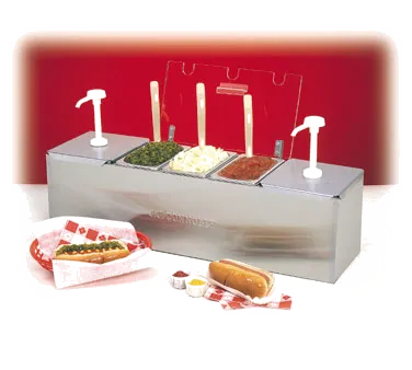 Introducing the Nemco 88100-CB-3 Condiment Dispenser Pump-Style, an innovative solution for culinary success in commercial restaurants. This Roll-A-Grill Condiment Station is designed to enhance efficiency and convenience in food preparation. With its stainless steel construction, this unit ensures durability and easy cleaning, making it perfect for busy restaurant kitchens. The station includes two 3 qt. stainless steel pans with pumps, allowing for easy dispensing of condiments, sauces, and dressings. Additionally, it features three .6 qt. middle pans with plastic covers and ladle cutouts, keeping your condiments fresh and easily accessible. The dry well unit ensures that your condiments stay at the perfect temperature for serving. Whether you're running a fast-paced diner or an upscale restaurant, the Nemco 88100-CB-3 Condiment Dispenser Pump-Style is a must-have for streamlining your condiment service and providing a seamless dining experience for your customers.