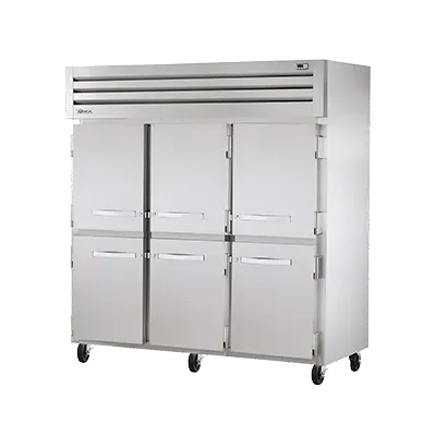 Cook with precision using the True Manufacturing STR3R-6HS Refrigerator, Reach-In. This top-of-the-line refrigerator is designed to meet the demanding needs of commercial restaurants. With its three-section layout and six stainless steel half doors, you'll have ample space to store all your ingredients and keep them organized. The cam-lift hinges and locks ensure that the doors stay securely closed, while the digital temperature control allows you to set the perfect temperature for your perishable items. The interior kits and LED lights make it easy to find what you need quickly, even in low-light conditions. Made in the USA with high-quality stainless steel construction, this refrigerator is built to last. With its 5" castors, it's also easy to move around for cleaning or rearranging. Trust True Manufacturing for reliable, efficient, and durable refrigeration solutions for your commercial kitchen.