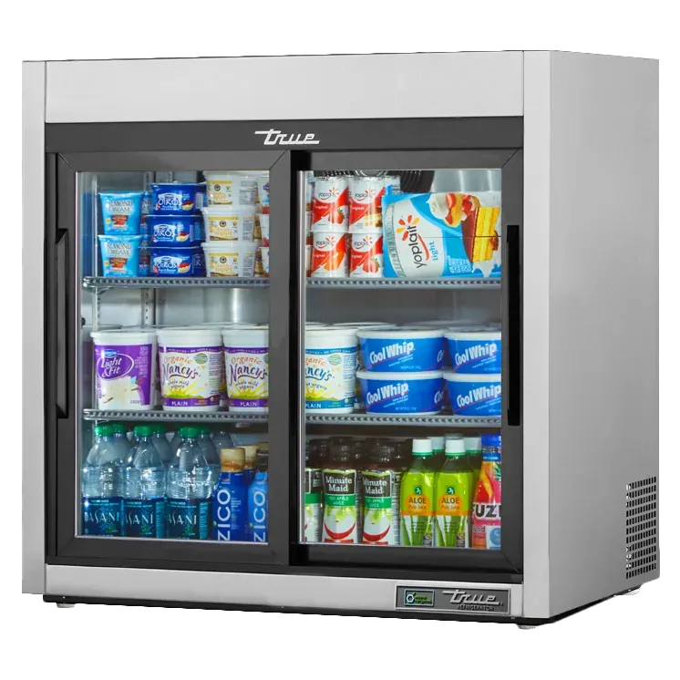 Master your restaurant's kitchen with the True Manufacturing TSD-09G-HC-LD Refrigerator Merchandiser. This countertop unit is designed to meet the needs of busy commercial kitchens, offering convenience and efficiency. With its two glass sliding doors, stainless steel front and sides, and clear coated aluminum interior with a stainless steel floor, this merchandiser is both durable and visually appealing. The three PVC coated wire shelves provide ample space for storing and displaying your products, while the LED interior lighting ensures optimal visibility. The TSD-09G-HC-LD also features leg levelers for easy installation and a 1/6 HP compressor for efficient cooling. Made in the USA and certified by cULus, UL EPH Classified, and CE, this True Manufacturing merchandiser is a reliable and high-quality addition to any commercial kitchen. Upgrade your restaurant's refrigeration capabilities with the TSD-09G-HC-LD Refrigerator Merchandiser.