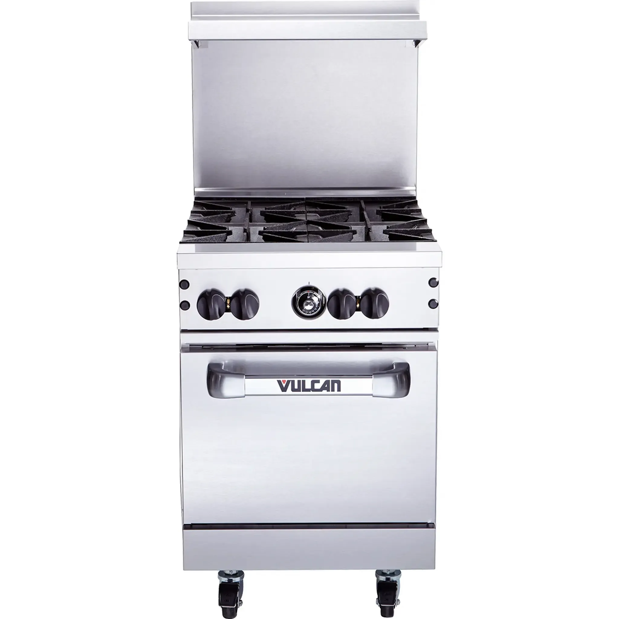 Discover kitchen perfection with the Vulcan, 24S-4B, Range, 24" Restaurant, Gas. This Endurance Restaurant Range is designed to meet the demands of a busy commercial kitchen. With four 30,000 BTU burners, this range provides powerful and precise heat for cooking a variety of dishes. The standard oven is perfect for baking and roasting, ensuring consistent and delicious results every time. The stainless steel front, sides, backriser, and lift-off high shelf not only give this range a sleek and professional look but also make it durable and easy to clean. The fully MIG welded frame adds strength and stability, while the 6" adjustable legs allow for easy leveling. With a total BTU of 143,000, this range is CSA and NSF certified, guaranteeing its safety and quality. Upgrade your restaurant kitchen with the Vulcan, 24S-4B, Range, 24" Restaurant, Gas.