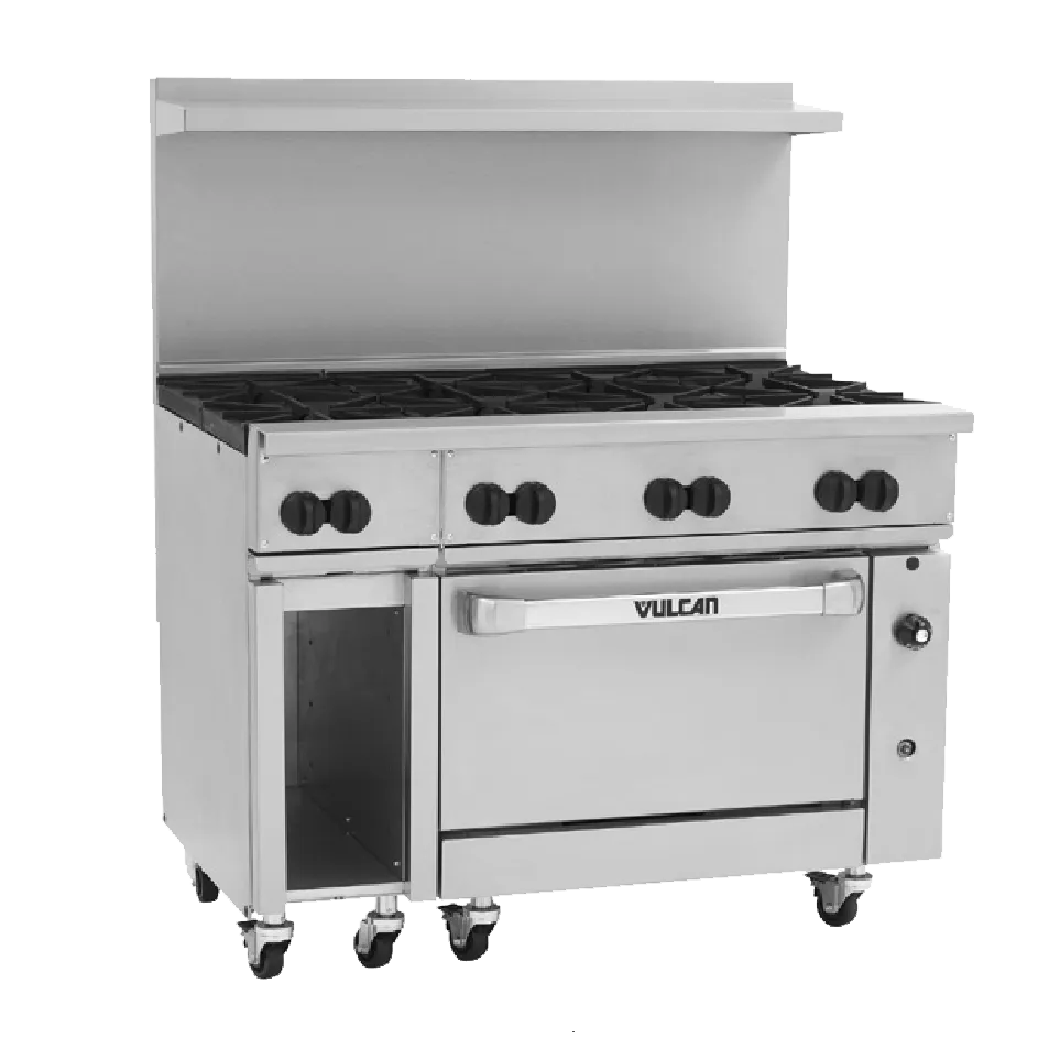 Discover kitchen perfection with the Vulcan 48C-8B Range, 48" Restaurant, Gas. This top-of-the-line restaurant range is designed to meet the demands of a busy commercial kitchen. With eight powerful 30,000 BTU burners, each equipped with lift-off burner heads, you'll have the precise control and heat distribution needed for cooking a variety of dishes. The convection oven ensures even baking and roasting, while the stainless steel construction of the front, sides, backriser, and high shelf guarantees durability and easy cleaning. The fully MIG welded frame and 6" adjustable legs provide stability and flexibility in any kitchen layout. With a total output of 275,000 BTU, this range delivers exceptional performance and efficiency. CSA and NSF certified, this Vulcan range is a reliable and safe choice for any commercial restaurant. Upgrade your kitchen with the Vulcan 48C-8B Range and experience the perfect blend of power, durability, and versatility.