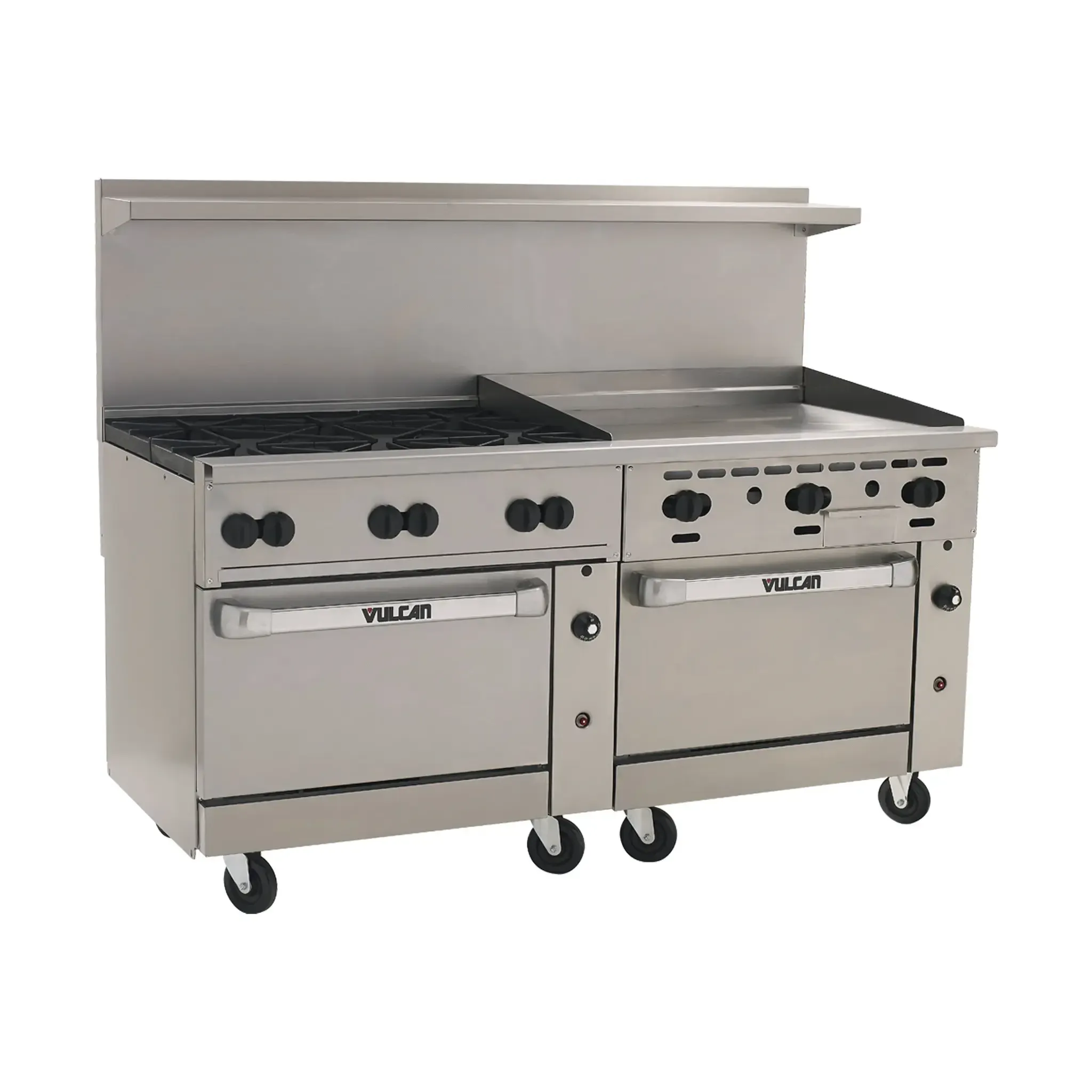 Empower your kitchen staff with the Vulcan 72SS-6B36GT Range, a powerhouse designed to meet the demands of a busy commercial restaurant. This Endurance Restaurant Range features six 30,000 BTU burners with lift-off burner heads, allowing for precise heat control and efficient cooking. The 36" thermostatic griddle, with its 3/4" thick plate and 4" wide front grease trough, ensures even heat distribution and easy cleanup. The stainless steel front, sides, backriser, and high shelf not only provide durability but also give your kitchen a sleek and professional look. With two standard oven bases, you can easily bake and roast a variety of dishes simultaneously. The fully MIG welded frame and 6" adjustable legs ensure stability and durability. With a total of 310,000 BTU, CSA Flame, CSA Star, and NSF certifications, this Vulcan Range is a reliable and efficient addition to any commercial kitchen.
