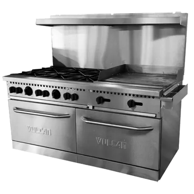 Cooking at its finest with the Vulcan SX60F-6B24GP Range, 60" Restaurant, Gas. This top-of-the-line restaurant range from Vulcan is designed to meet the demands of a busy commercial kitchen. With six 28,000 BTU burners and lift-off burner heads, you'll have precise control over your cooking. The 24" griddle provides a versatile cooking surface for pancakes, burgers, and more. The two standard ovens are perfect for baking, roasting, and keeping dishes warm. Made with a stainless steel front, sides, backriser, and high shelf, this range is not only durable but also easy to clean. The fully MIG welded frame ensures stability and longevity. With 258,000 BTU of power, this range can handle any cooking task with ease. The adjustable legs allow for easy leveling on any surface. ETL-Sanitation certified, this range meets the highest standards of cleanliness and safety. Upgrade your commercial kitchen with the Vulcan SX60F-6B24GP Range, 60" Restaurant, Gas.