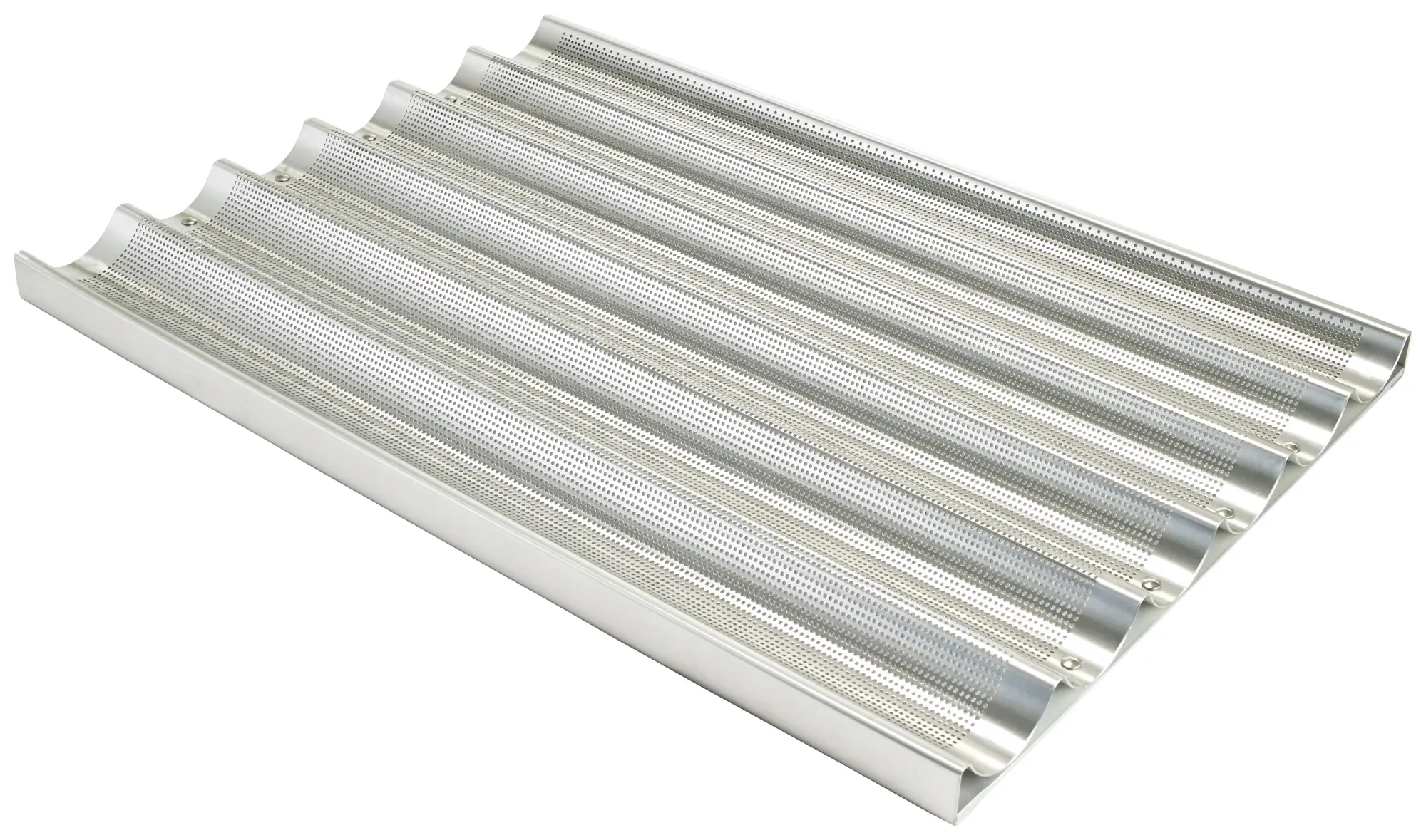 Engineered for excellence using top-tier materials, the Winco Baguette Pan is an essential addition to any restaurant's kitchen. This high-quality pan features 6 slots, each perfectly designed to bake baguettes to perfection. Measuring 18x26x1 inches overall, it provides ample space for multiple loaves, ensuring efficient baking during busy service hours. Crafted from 16 gauge silicon glaze aluminum, the Winco Baguette Pan offers superior heat conductivity and durability. The silicon glaze not only enhances the pan's non-stick properties but also ensures easy release of the baguettes, maintaining their perfect shape and crust. This makes it an ideal choice for professional bakers and chefs who demand consistency and quality in their baked goods. The robust construction of the Winco Baguette Pan ensures it can withstand the rigors of a commercial kitchen, providing long-lasting performance. Its design allows for even heat distribution, which is crucial for achieving the perfect bake every time. Whether you're baking traditional French baguettes or experimenting with new recipes, this pan will help you achieve outstanding results. Incorporating the Winco Baguette Pan into your kitchen setup will streamline your baking process, allowing you to produce high-quality baguettes efficiently. Its practical design and durable materials make it a valuable investment for any restaurant aiming to elevate its bread offerings. Choose the Winco Baguette Pan for your restaurant and experience the difference in quality and performance that comes with using a product engineered for excellence.