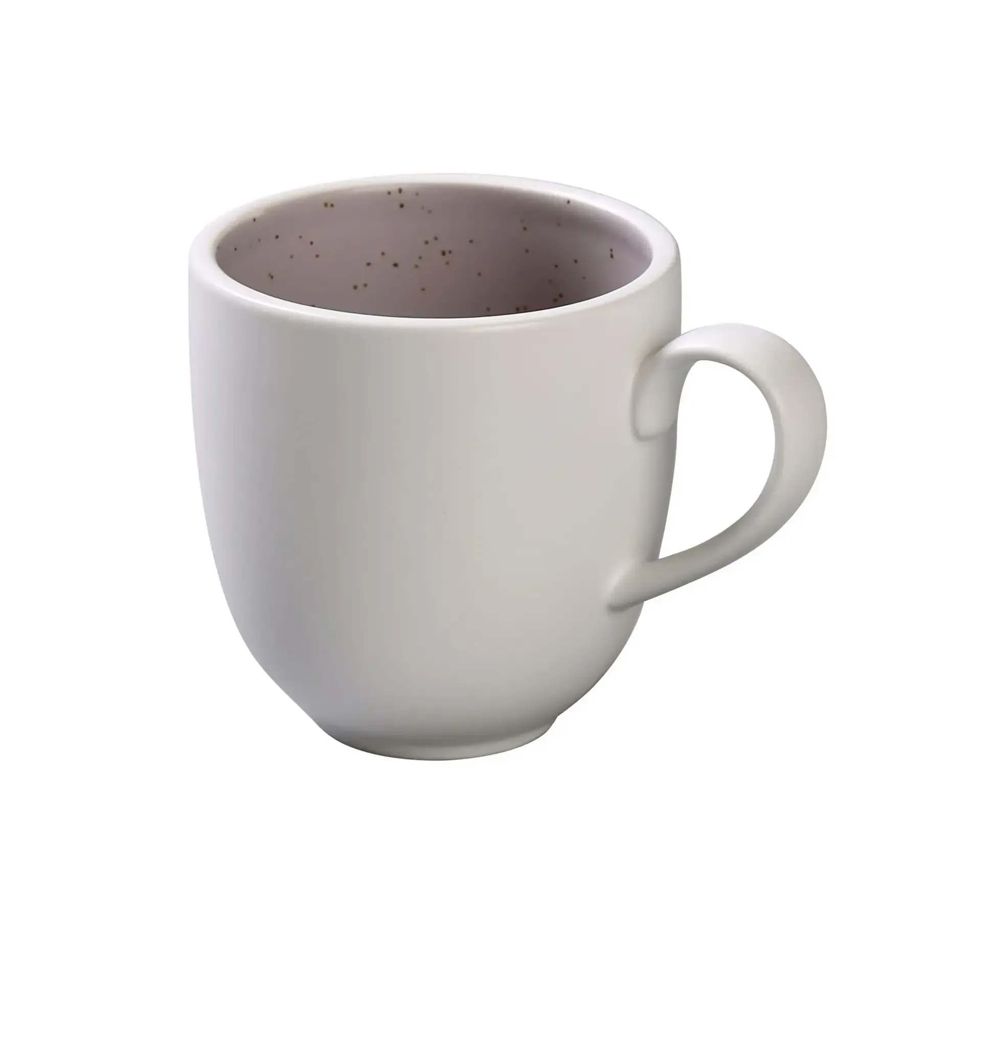 Denmark porcelain pieces reverse traditional conventions with their patterned wells highlighted by bold undecorated rims. The speckled light purple design creates a great backdrop for the food, while maintaining a clean modern look.